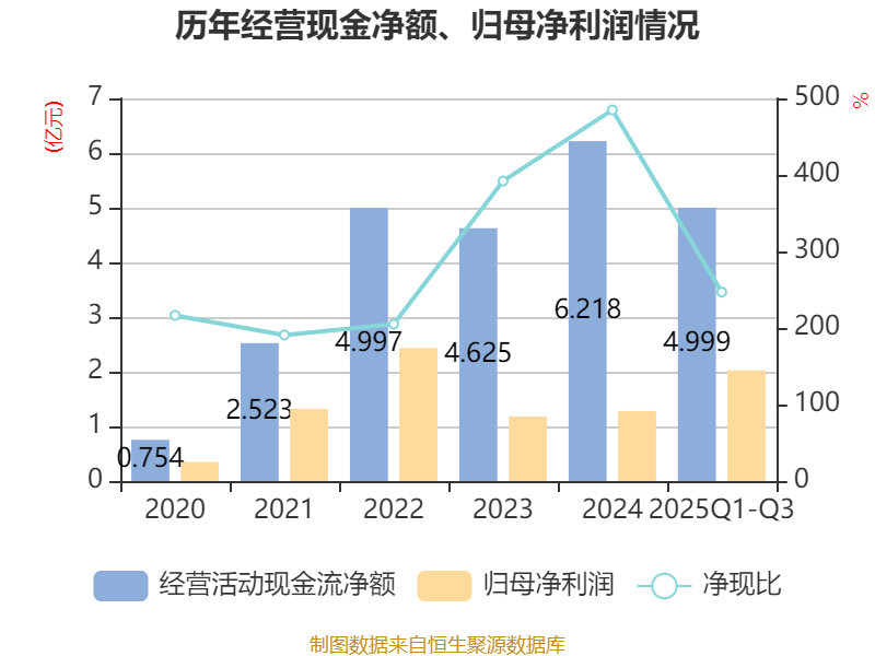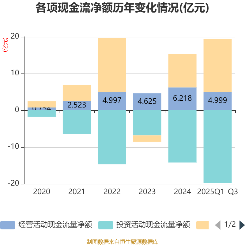 2025年前三季度,公司经营活动现金流净额为5亿元,同比增长66.43%;筹资活动现金流净额14.4亿元,同比增加8.54亿元;投资活动现金流净额-19.83亿元,上年同期为-9.55亿元。