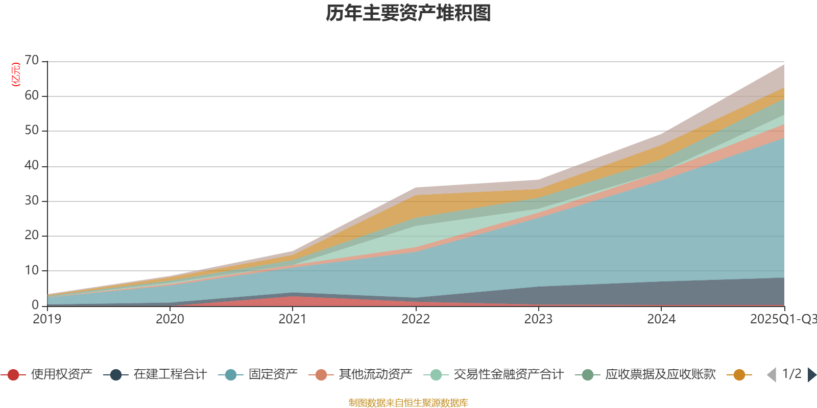 资产重大变化方面,截至2025年三季度末,公司交易性金融资产合计占公司总资产的3.85%,上年末为0;货币资金较上年末减少22.95%,占公司总资产比重下降3.8个百分点;其他非流动资产较上年末增加358.06%,占公司总资产比重上升3.42个百分点;在建工程合计较上年末增加16.67%,占公司总资产比重下降2.3个百分点。