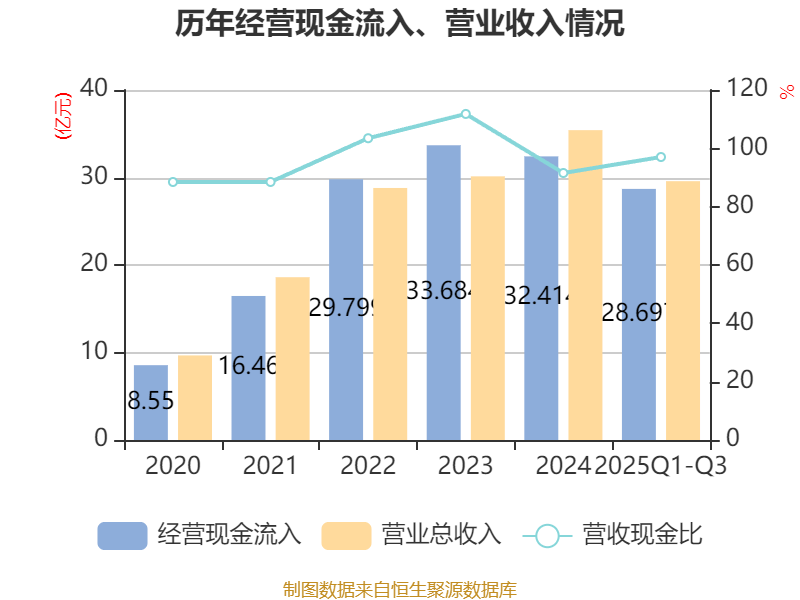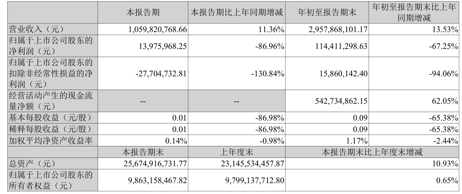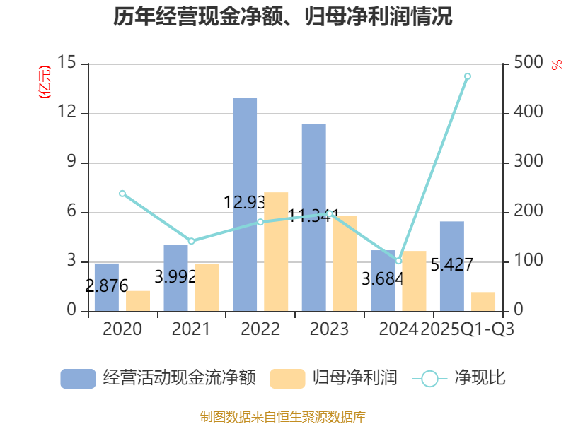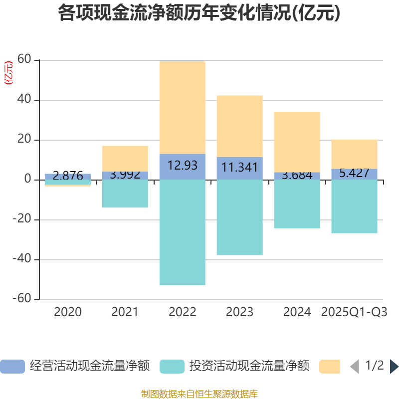 2025年前三季度,公司经营活动现金流净额为5.43亿元,同比增长62.05%;筹资活动现金流净额14.67亿元,同比减少7.5亿元;投资活动现金流净额-26.91亿元,上年同期为-8.07亿元。