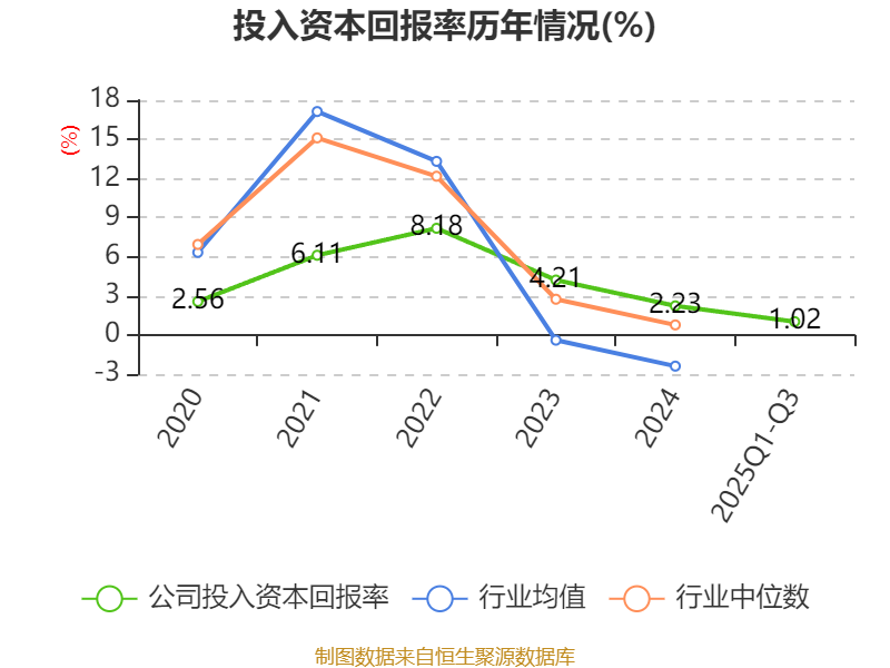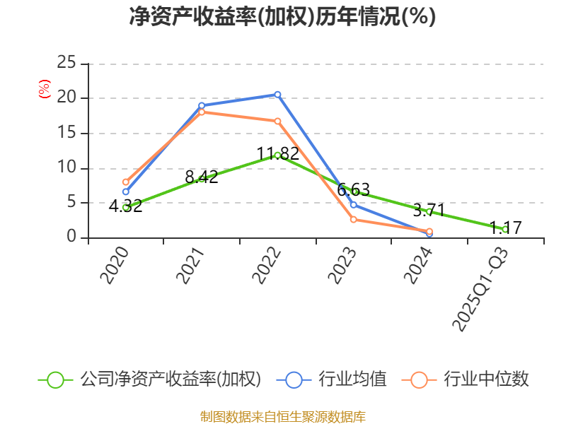盈利能力方面, 2025年前三季度公司加权平均净资产收益率为1.17%,同比下降2.44个百分点。公司2025年前三季度投入资本回报率为1.02%,较上年同期下降1.23个百分点。