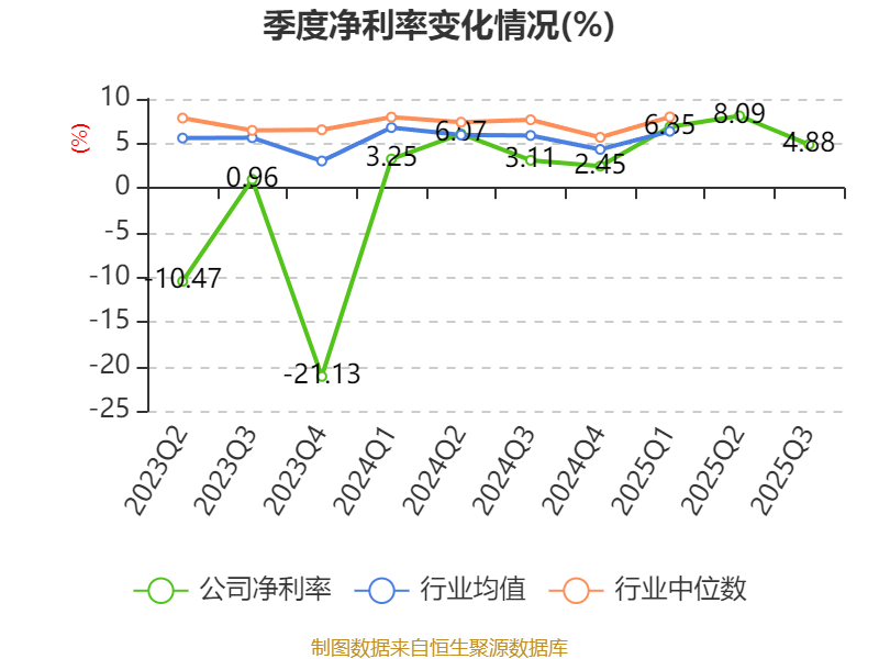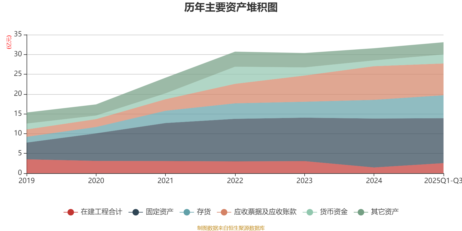 资产重大变化方面,截至2025年三季度末,公司固定资产较上年末减少8.19%,占公司总资产比重下降4.85个百分点;在建工程合计较上年末增加74.98%,占公司总资产比重上升3.1个百分点;应收票据及应收账款较上年末减少5.51%,占公司总资产比重下降2.65个百分点;存货较上年末增加22.67%,占公司总资产比重上升2.55个百分点。