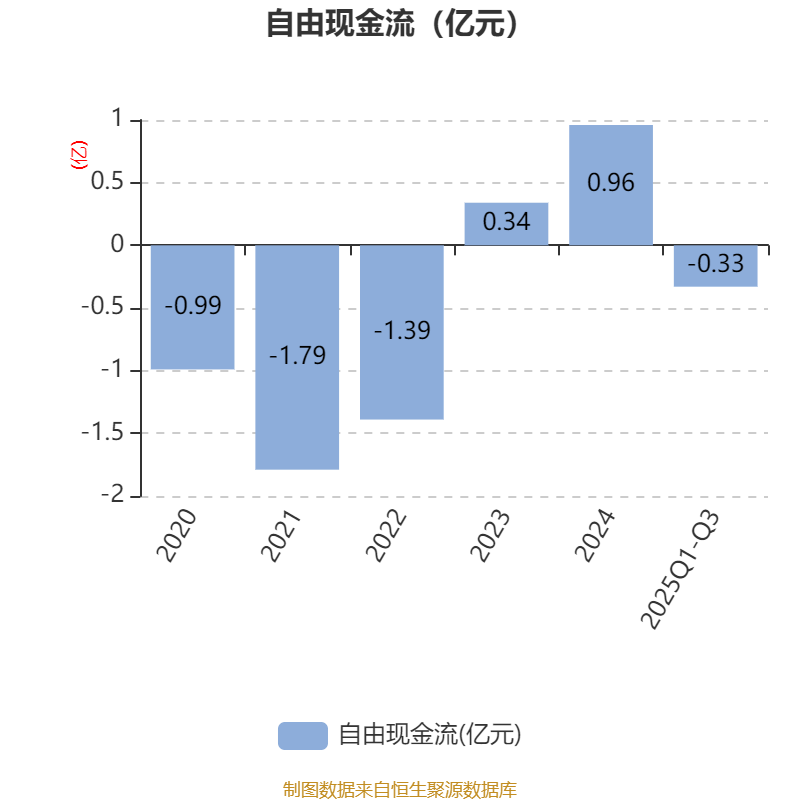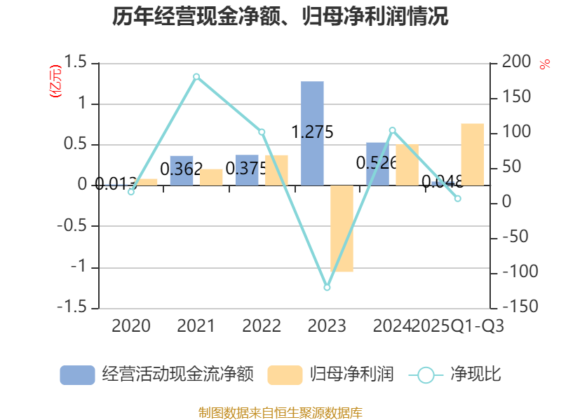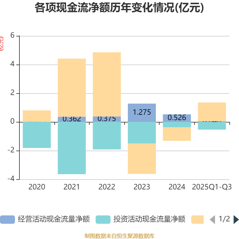 2025年前三季度,公司经营活动现金流净额为479.63万元,同比下降89.92%;筹资活动现金流净额1.3亿元,同比增加2亿元;投资活动现金流净额-5390.52万元,上年同期为-4910.71万元。