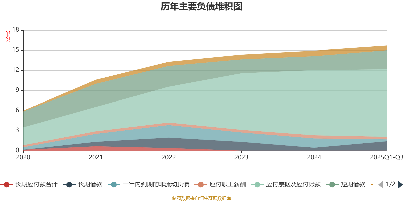 负债重大变化方面,截至2025年三季度末,公司一年内到期的非流动负债较上年末减少80.03%,占公司总资产比重下降3.57个百分点;长期借款较上年末增加225.58%,占公司总资产比重上升2.87个百分点;短期借款较上年末增加37.5%,占公司总资产比重上升2.04个百分点;应付票据及应付账款较上年末增加3.42%,占公司总资产比重下降0.42个百分点。