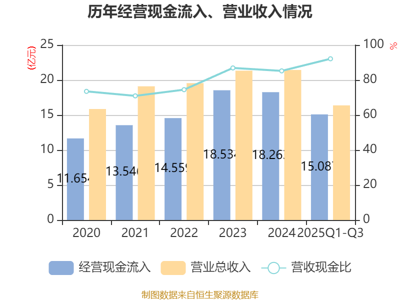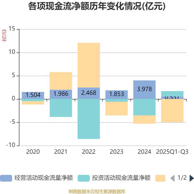 2025年前三季度,公司经营活动现金流净额为5374.48万元,同比增长846.22%;筹资活动现金流净额-4.98亿元,同比减少3.71亿元;投资活动现金流净额1.14亿元,上年同期为-2亿元。