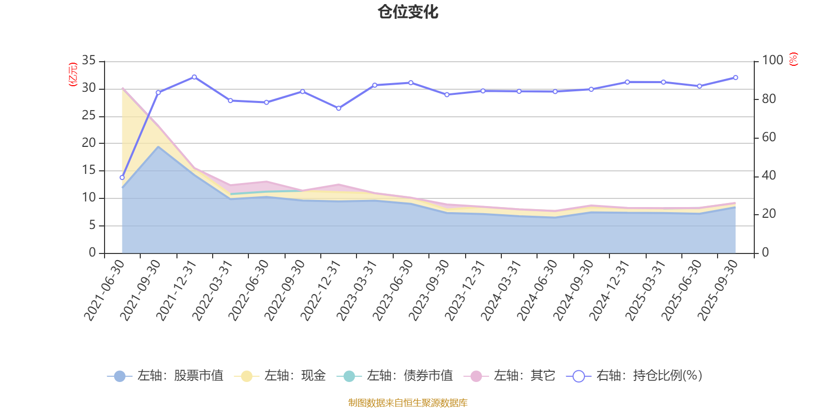 据定期报告数据统计,近三年平均股票仓位为85.8%,同类平均为85.84%。2021年末基金达到91.77%的最高仓位,2021年上半年末最低,为39.44%。