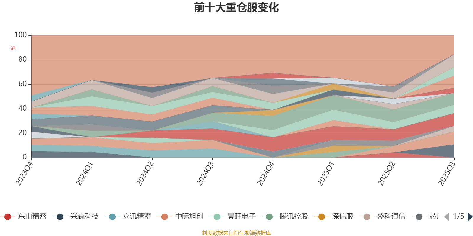 该基金持股集中度较高。截至2025年三季度末,基金十大重仓股分别是兴森科技、中际旭创、寒武纪、新易盛、工业富联、海光信息、天孚通信、麦格米特、盛科通信、中科曙光。
