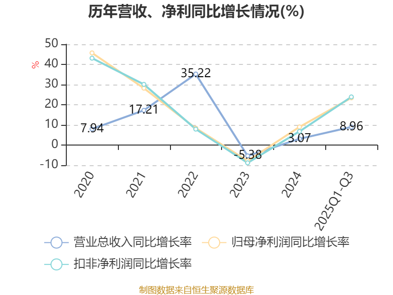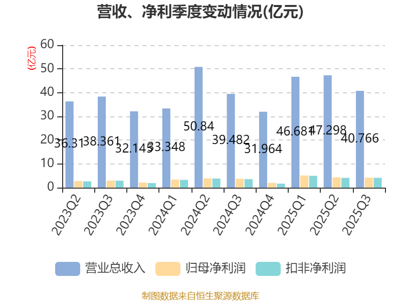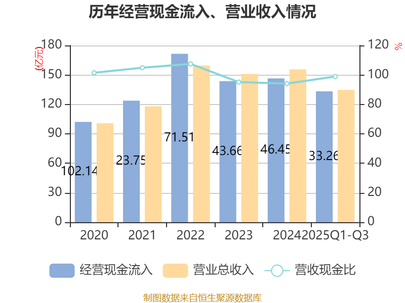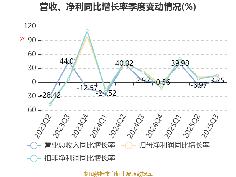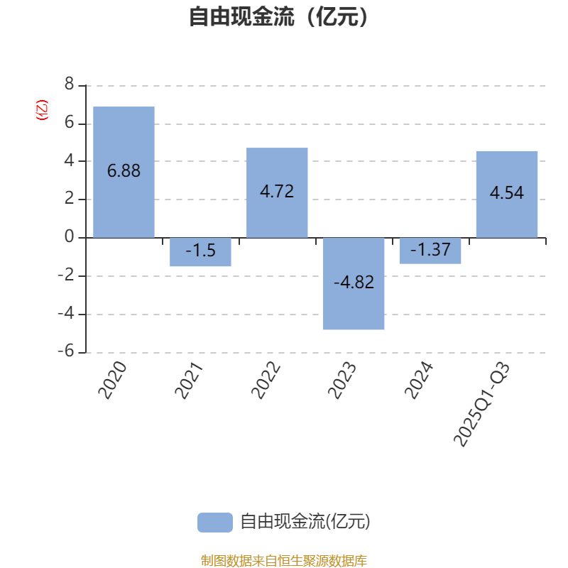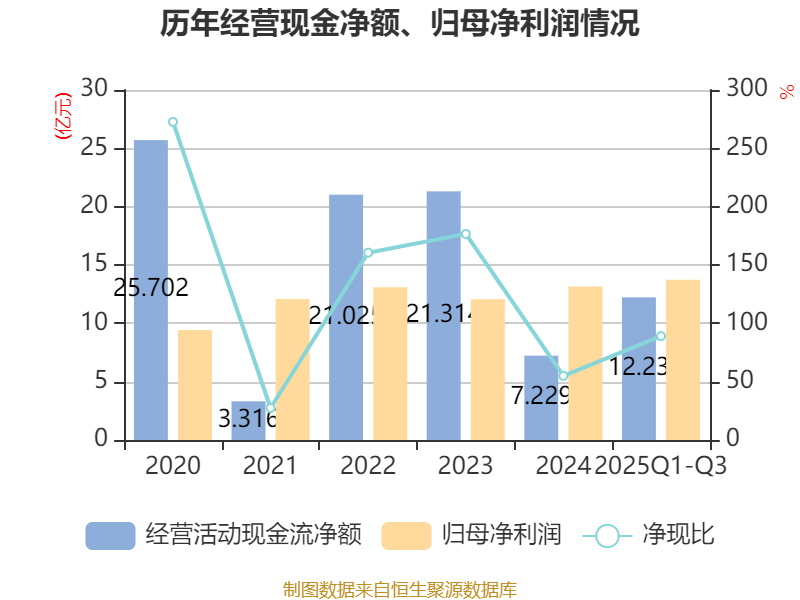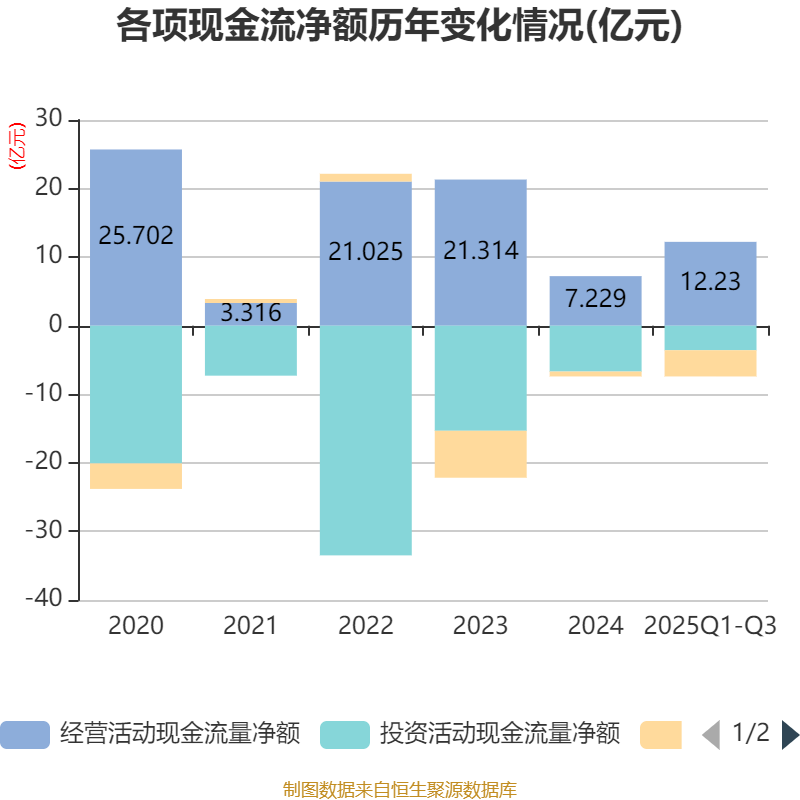 2025年前三季度,公司经营活动现金流净额为12.23亿元,同比增长190.5%;筹资活动现金流净额-3.83亿元,同比减少3.47亿元;投资活动现金流净额-3.57亿元,上年同期为-3.07亿元。