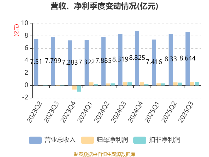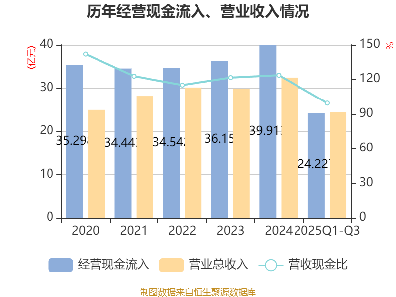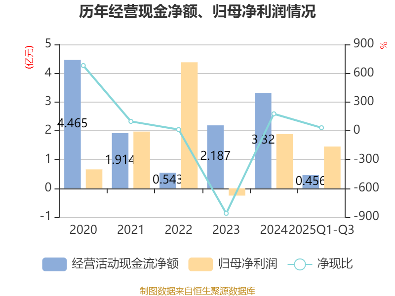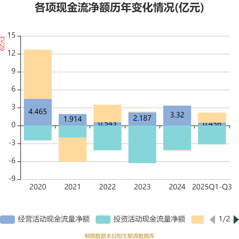 2025年前三季度,公司经营活动现金流净额为4564.95万元,同比增加6854.21万元;筹资活动现金流净额1.7亿元,同比增加1.02亿元;投资活动现金流净额-3.16亿元,上年同期为-4.27亿元。