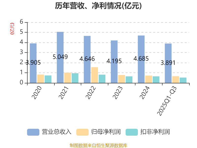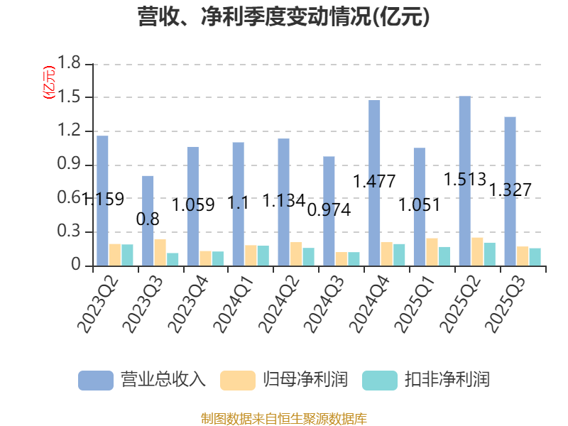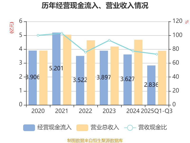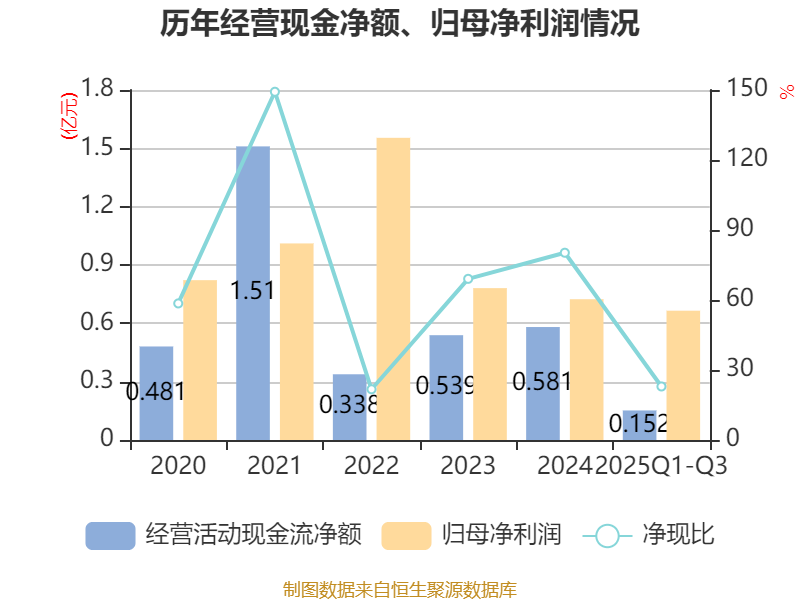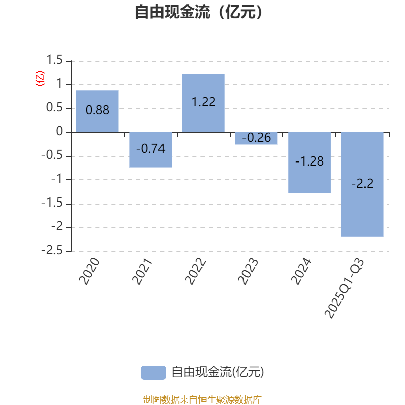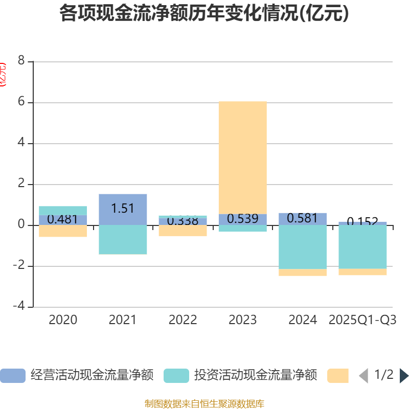 2025年前三季度,公司经营活动现金流净额为1524.77万元,同比下降74.32%;筹资活动现金流净额-3118.38万元,同比减少11.95万元;投资活动现金流净额-2.14亿元,上年同期为-3.52亿元。