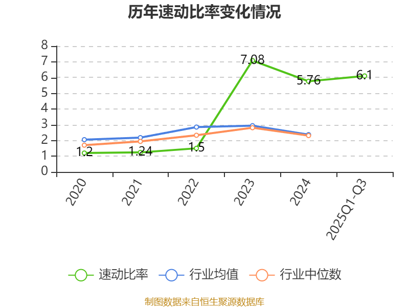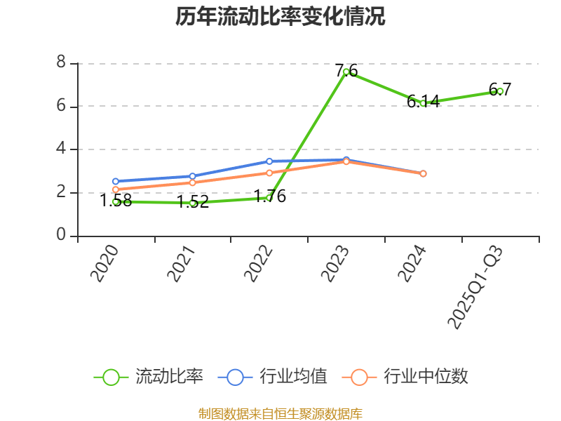 2025年前三季度,公司流动比率为6.7,速动比率为6.1。