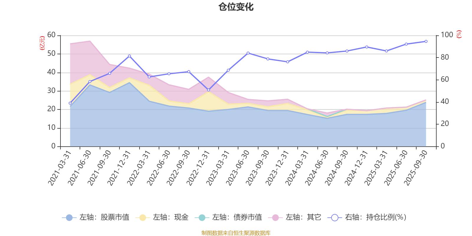 据定期报告数据统计,近三年平均股票仓位为81.35%,同类平均为85.99%。2025年三季度末基金达到94.63%的最高仓位,2021年一季度末最低,为39.02%。