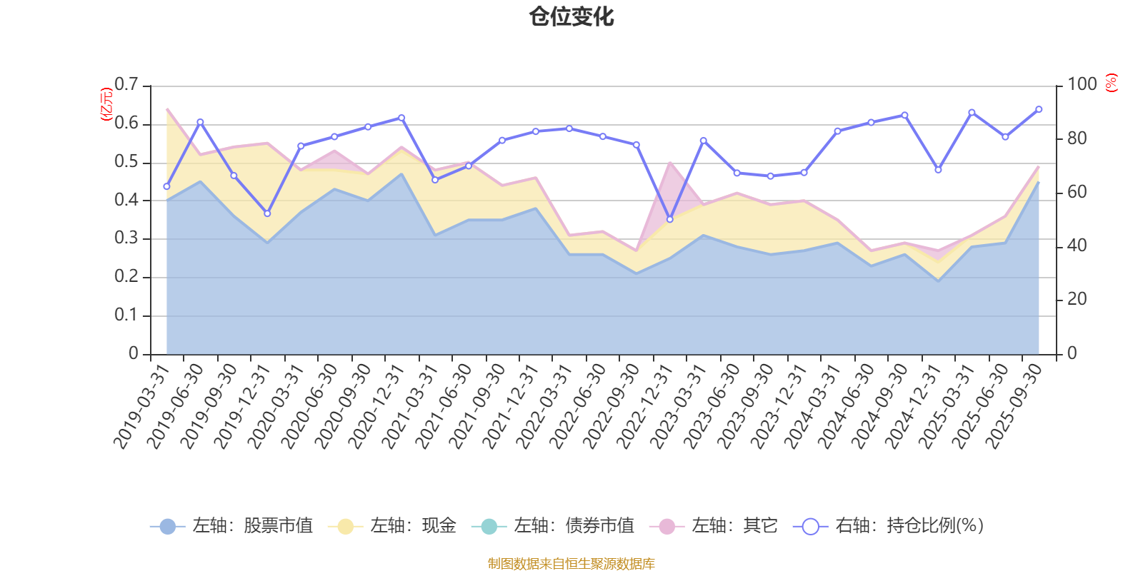 据定期报告数据统计,近三年平均股票仓位为76.72%,同类平均为72.19%。2025年三季度末基金达到91.21%的最高仓位,2022年末最低,为50.23%。