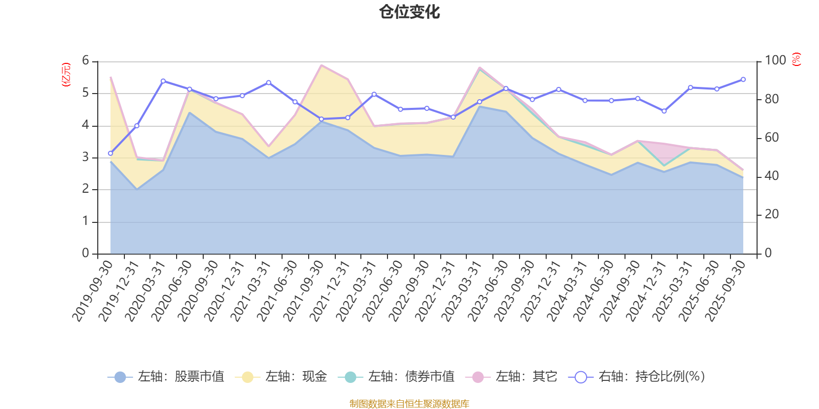 据定期报告数据统计,近三年平均股票仓位为81.53%,同类平均为85.51%。2025年三季度末基金达到90.61%的最高仓位,2019年三季度末最低,为52.23%。