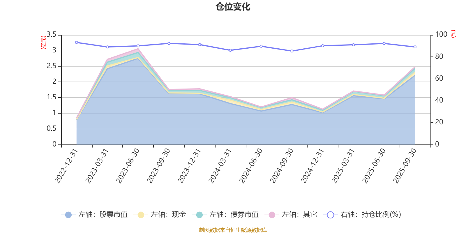 据定期报告数据统计,近三年平均股票仓位为89.95%,同类平均为88.26%。2022年末基金达到93.18%的最高仓位,2024年三季度末最低,为85.35%。