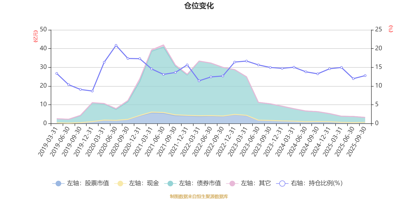 据定期报告数据统计,近三年平均股票仓位为14.57%,同类平均为19.03%。2020年上半年末基金达到20.86%的最高仓位,2019年末最低,为8.66%。