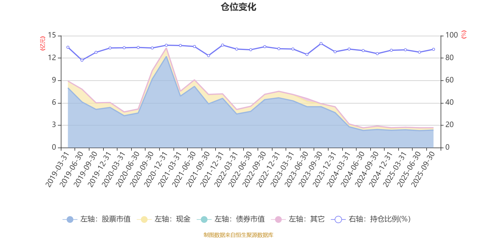 据定期报告数据统计,近三年平均股票仓位为87.07%,同类平均为88.21%。2023年三季度末基金达到93%的最高仓位,2019年上半年末最低,为78.13%。