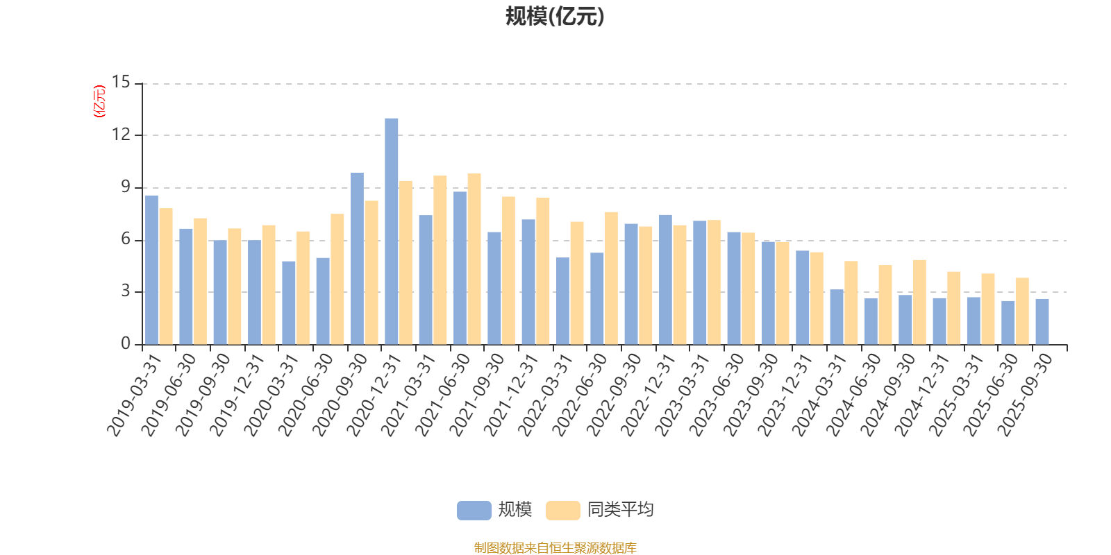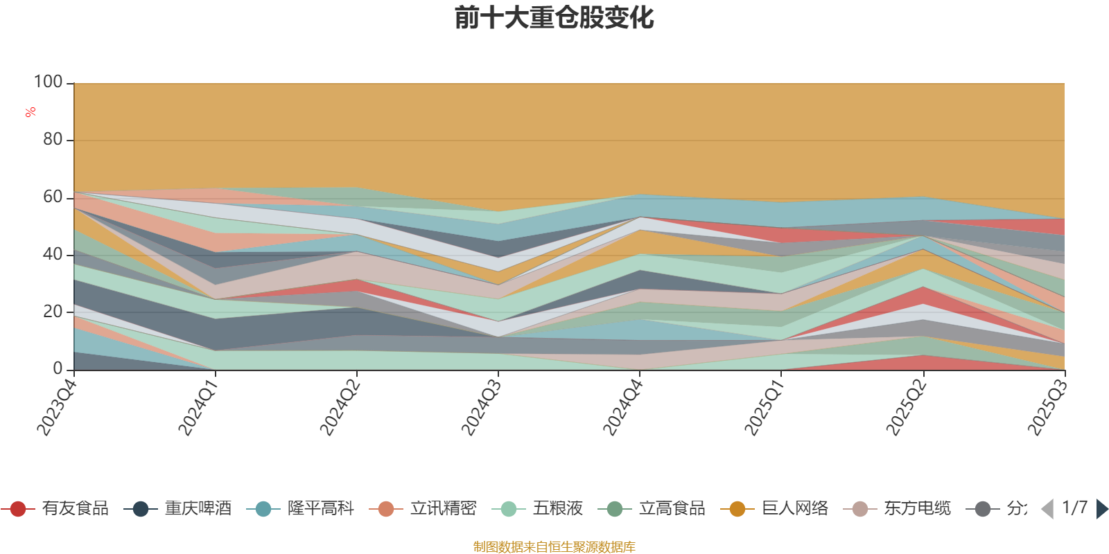 该基金持股集中度较高。截至2025年三季度末,基金十大重仓股分别是宁德时代、恒生电子、新易盛、东鹏饮料、拓普集团、同花顺、ST华通、巨人网络、分众传媒、工业富联。