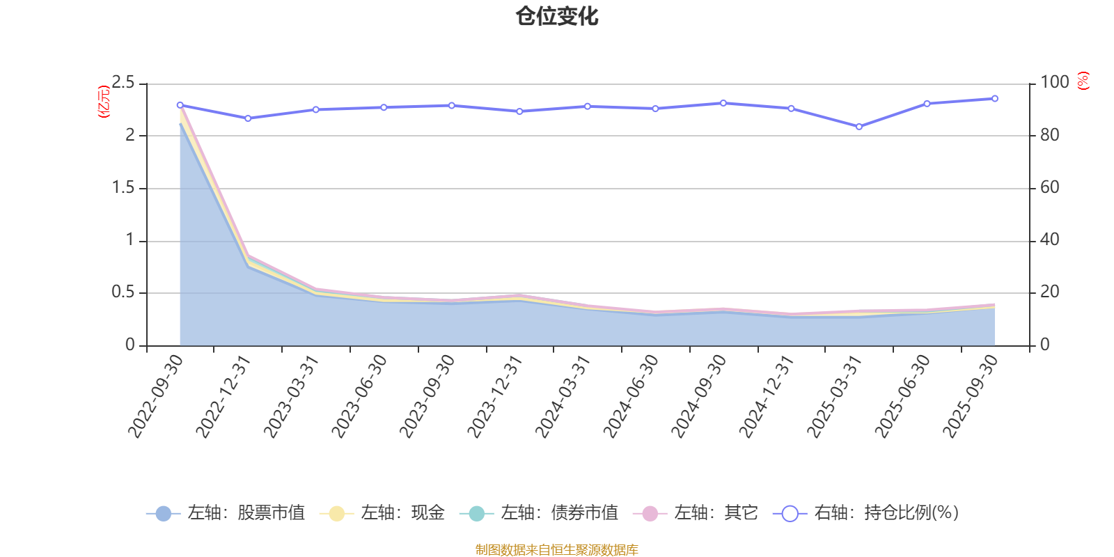据定期报告数据统计,近三年平均股票仓位为90.31%,同类平均为88.29%。2025年三季度末基金达到94.29%的最高仓位,2025年一季度末最低,为83.55%。