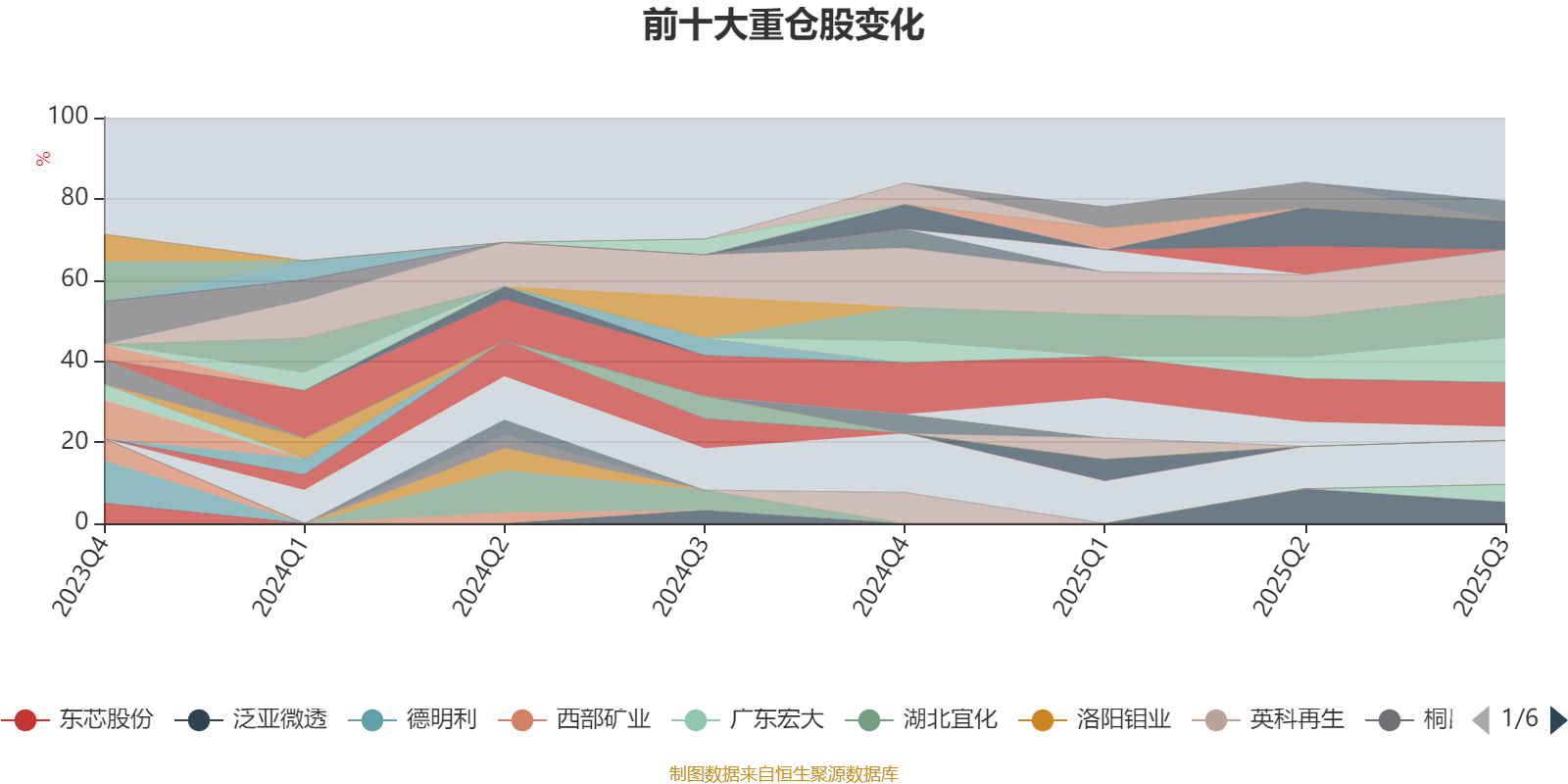 该基金持股集中度较高,近2年前十大重仓股集中度长期超过60%。截至2025年三季度末,基金十大重仓股分别是东岳集团、永和股份、巨化股份、三美股份、昊华科技、嘉澳环保、泛亚微透、新宙邦、广东宏大、山高环能。