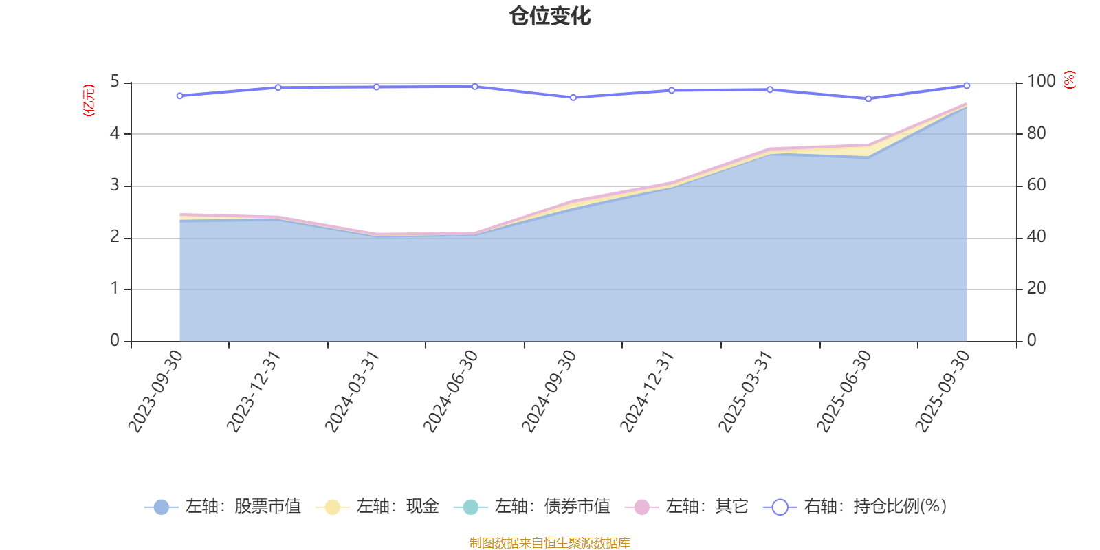 据定期报告数据统计,基金股票仓位长期保持较高水平,成立以来平均股票仓位为96.74%,同类平均为85.51%。2025年三季度末基金达到98.79%的最高仓位,2025年上半年末最低,为93.73%。