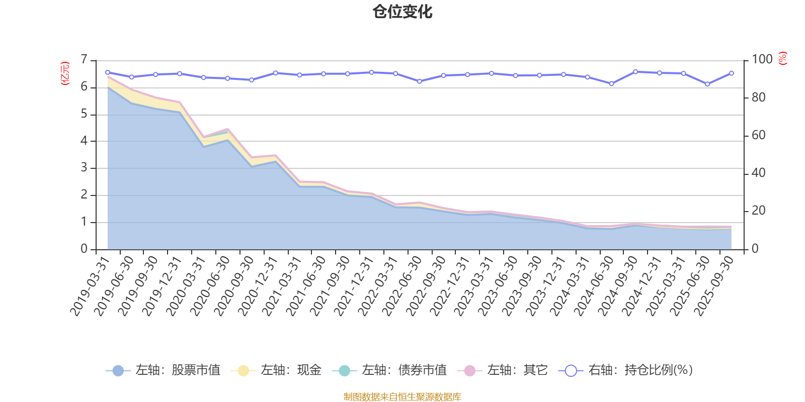 据定期报告数据统计,近三年平均股票仓位为91.83%,同类平均为83.5%。2024年三季度末基金达到93.97%的最高仓位,2025年上半年末最低,为87.45%。