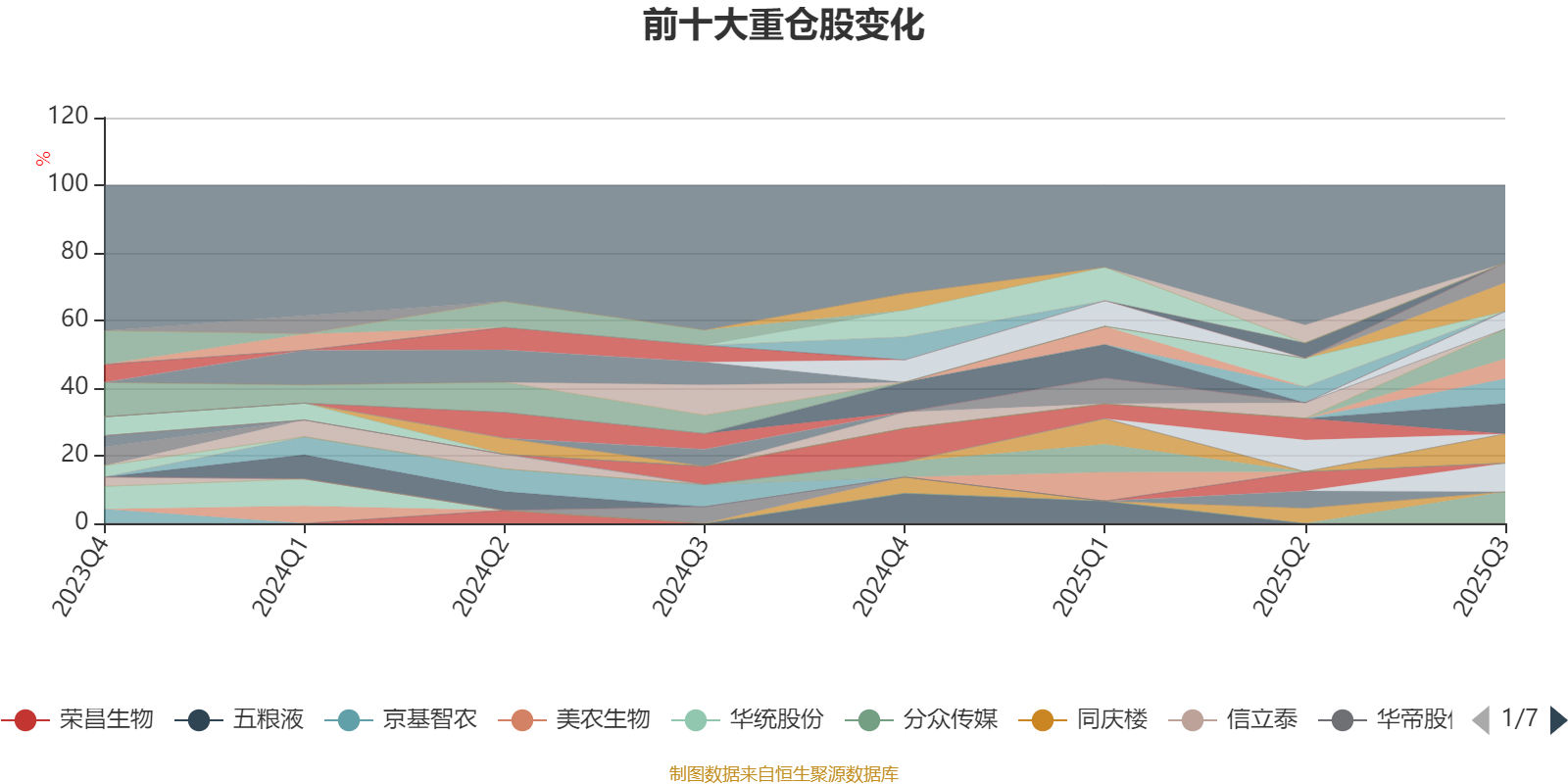 该基金持股集中度较高。截至2025年三季度末,基金十大重仓股分别是分众传媒、贵州茅台、中国海油、美的集团、长江电力、中国移动、福耀玻璃、盐湖股份、中创智领、梅花生物。