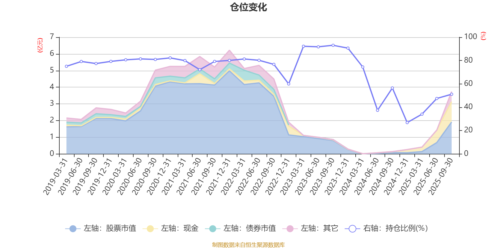据定期报告数据统计,近三年平均股票仓位为62.96%,同类平均为72.16%。2023年三季度末基金达到93.07%的最高仓位,2024年末最低,为26.83%。
