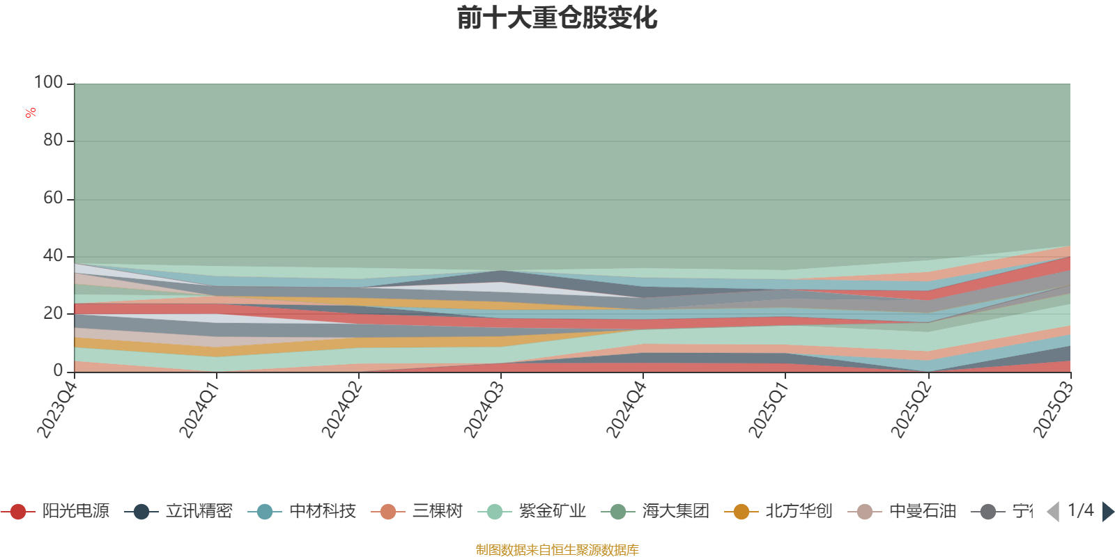 截至2025年三季度末,基金十大重仓股分别是紫金矿业、立讯精密、山金国际、新泉股份、中材科技、阳光电源、纽威股份、海大集团、三棵树、宁德时代。
