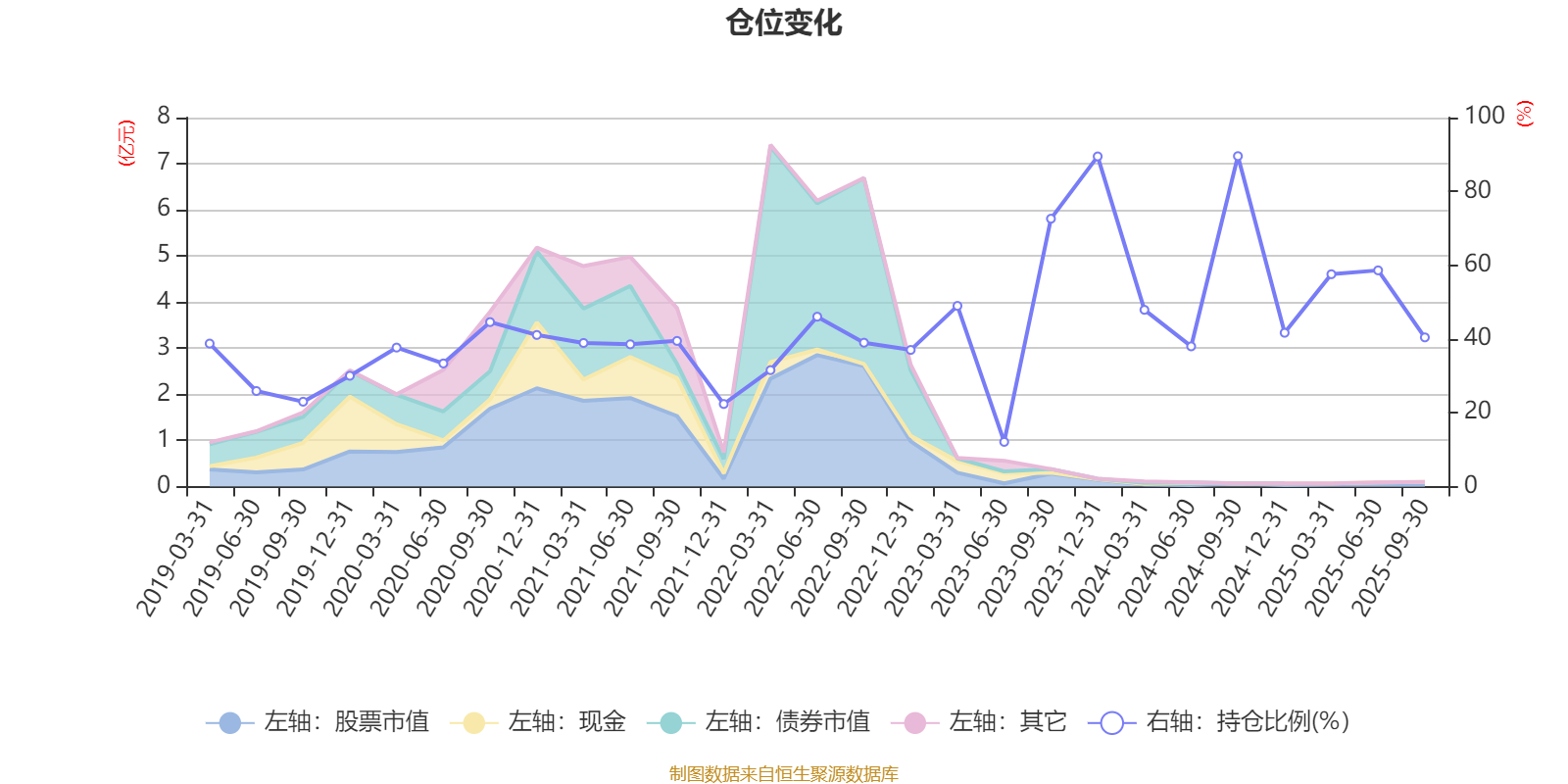 据定期报告数据统计,近三年平均股票仓位为52.83%,同类平均为72.16%。2024年三季度末基金达到89.56%的最高仓位,2023年上半年末最低,为12.11%。