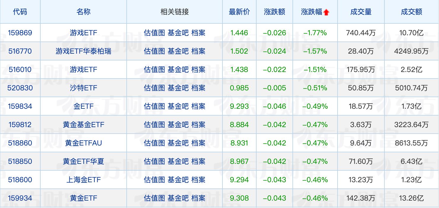 下跌方面,多只游戏ETF回调居前,最高下跌1.77%。