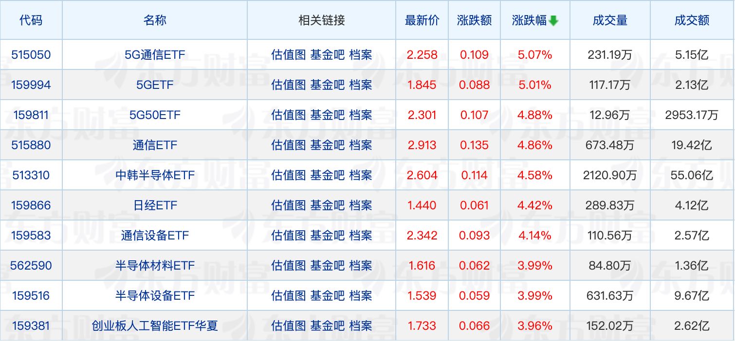 具体来看,5G、通信相关ETF全线走强,最高涨5.07%。