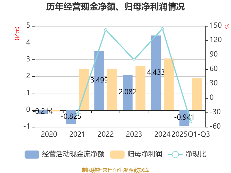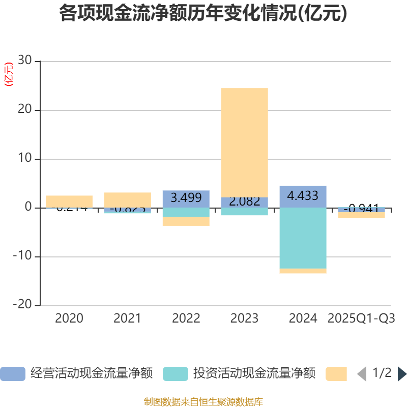2025年前三季度,公司经营活动现金流净额为-9408.36万元,同比减少5.28亿元;筹资活动现金流净额-1.22亿元,同比增加6140.82万元;投资活动现金流净额1171.27万元,上年同期为-1.49亿元。