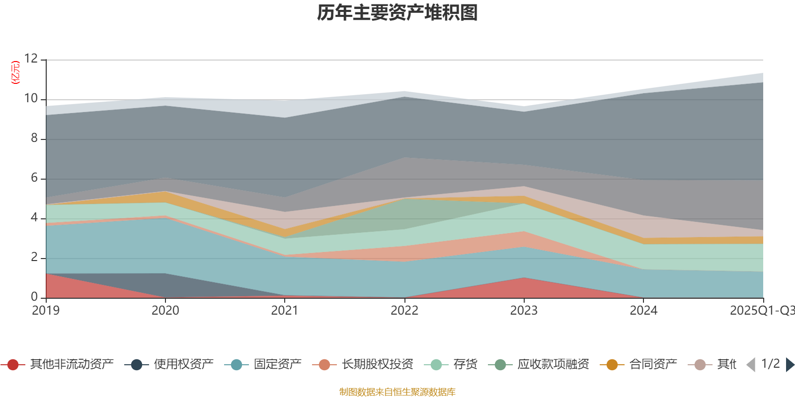 资产重大变化方面,截至2025年三季度末,公司其他应收款(含利息和股利)较上年末减少72.21%,占公司总资产比重下降8个百分点;应收票据及应收账款较上年末增加40.06%,占公司总资产比重上升5.09个百分点;货币资金较上年末增加13.05%,占公司总资产比重上升2.03个百分点;固定资产较上年末减少7.75%,占公司总资产比重下降1.95个百分点。