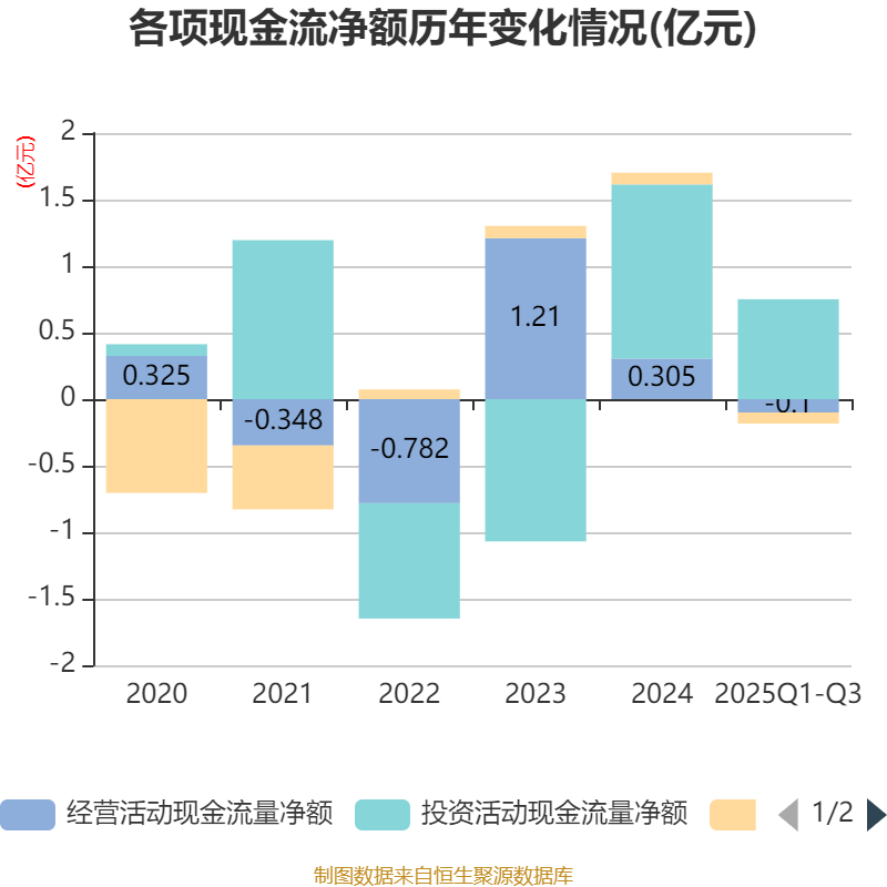 2025年前三季度,公司经营活动现金流净额为-996.44万元,同比减少1472.27万元;筹资活动现金流净额-840.16万元,同比减少180.15万元;投资活动现金流净额7507.41万元,上年同期为9466.62万元。