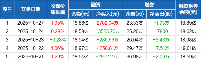 中银证券融资融券信息显示,2025年10月27日融资净买入2702.04万元;融资余额18.86亿元,较前一日增加1.45%。