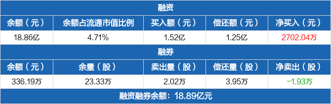 融资方面,当日融资买入1.52亿元,融资偿还1.25亿元,融资净买入2702.04万元。融券方面,融券卖出2.02万股,融券偿还3.95万股,融券余量23.33万股,融券余额336.19万元。融资融券余额合计18.89亿元。