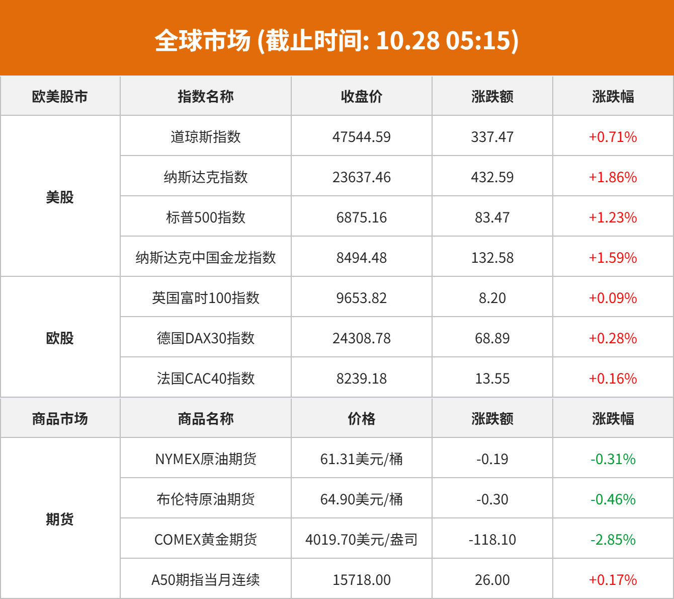商品市场:国际油价10月27日下跌。截至当天收盘,纽约商品交易所WTI原油期货当月连续合约结算价下跌0.19美元,收于每桶61.31美元,跌幅为0.31%;伦敦布伦特原油期货当月连续合约下跌0.30美元,收于每桶64.9美元,跌幅为0.46%。COMEX黄金期货当月连续合约结算价下跌118.10美元,跌幅2.85%,报4019.7美元/盎司。