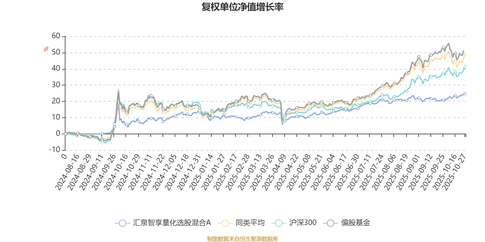 截至10月27日,汇泉智享量化选股混合A近三个月复权单位净值增长率为3.32%,位于同类可比基金607/689;近半年复权单位净值增长率为12.48%,位于同类可比基金603/688;近一年复权单位净值增长率为15.60%,位于同类可比基金507/653。