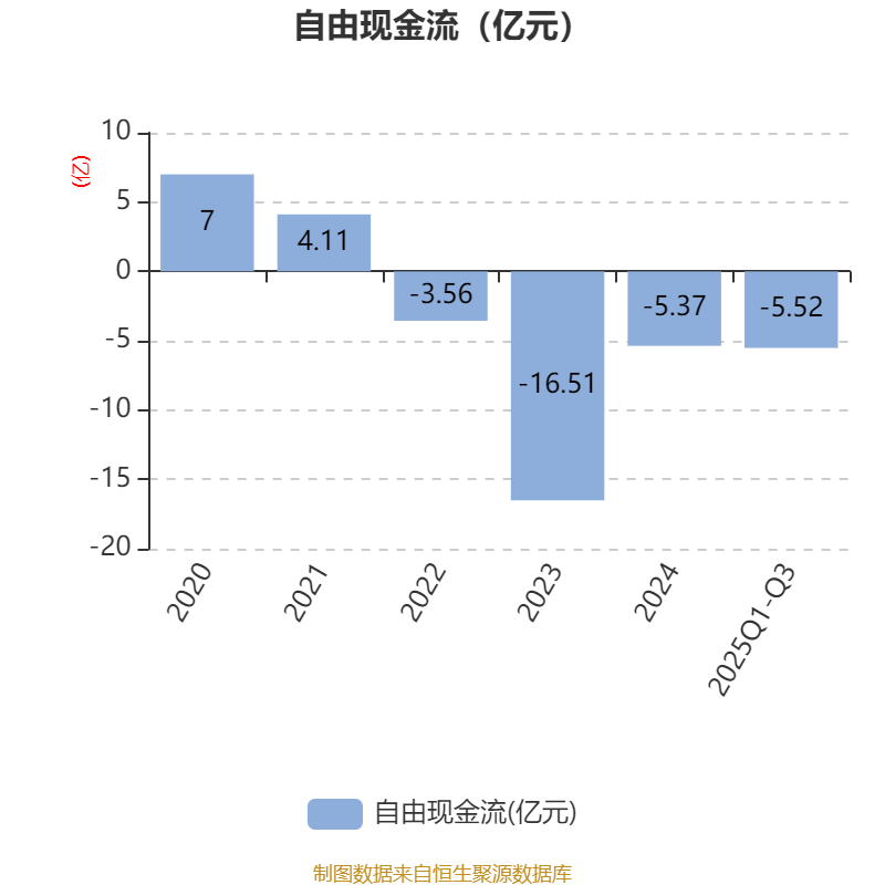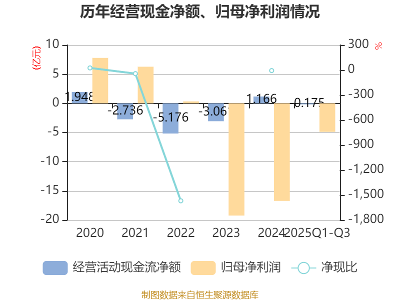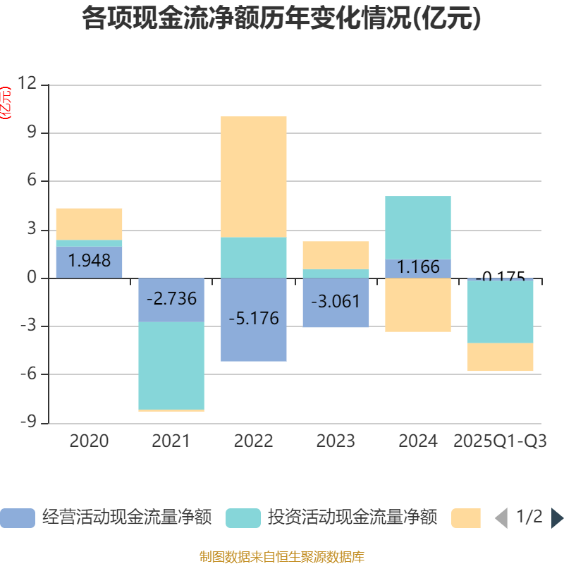 2025年前三季度,公司经营活动现金流净额为-1747.9万元,同比增加2.17亿元;筹资活动现金流净额-1.72亿元,同比增加8395.51万元;投资活动现金流净额-3.87亿元,上年同期为2.41亿元。