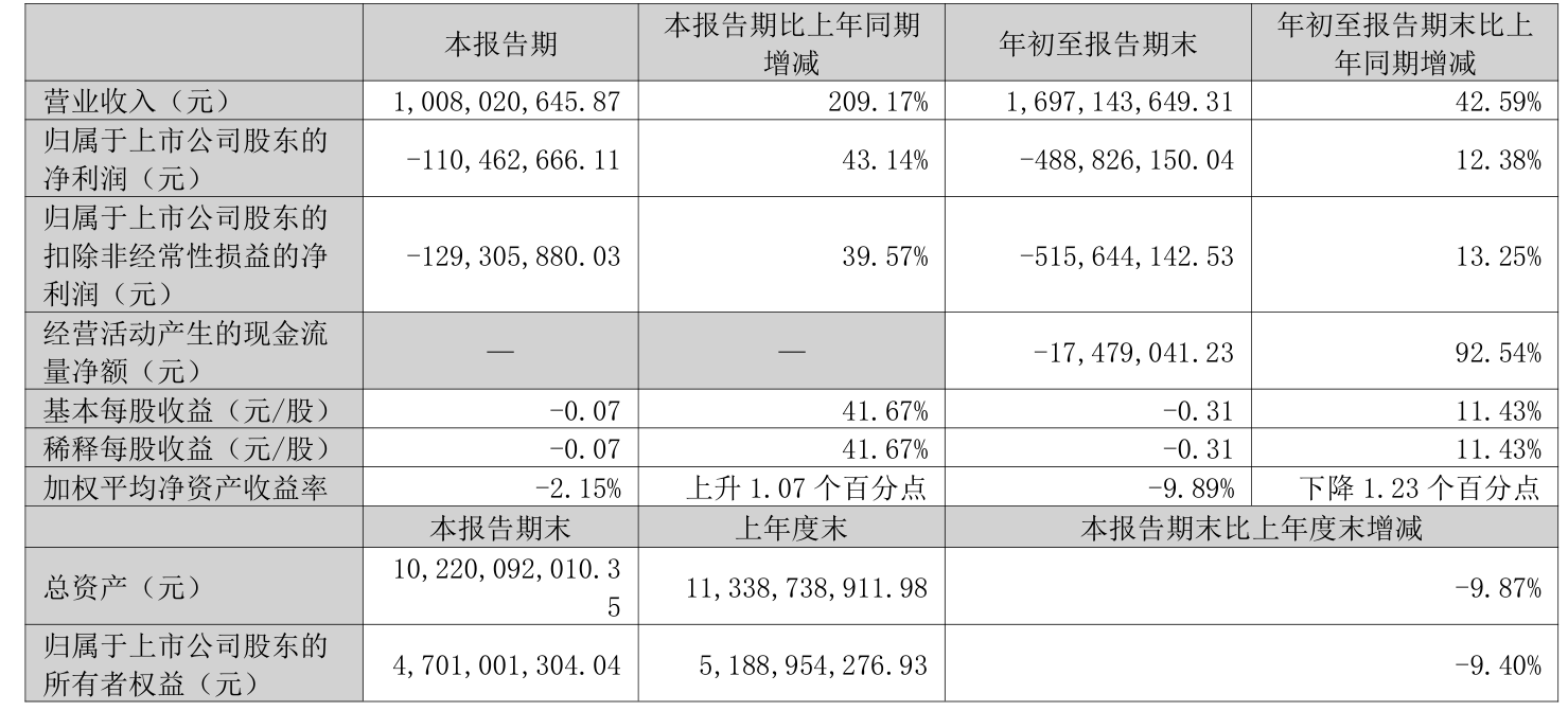 中证智能财讯航天发展(000547)10月28日披露2025年第三季度报告。前三季度公司实现营业总收入16.97亿元,同比增长42.59%;归母净利润亏损4.89亿元,上年同期亏损5.58亿元;扣非净利润亏损5.16亿元,上年同期亏损5.94亿元;经营活动产生的现金流量净额为-1747.9万元,上年同期为-2.34亿元;报告期内,航天发展基本每股收益为-0.31元,加权平均净资产收益率为-9.89%。