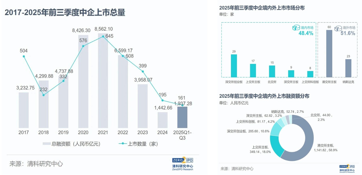 来自清科研究中心的数据显示,2025年前三季度中企境内外上市161家,同比增加25.8%;首发融资额约合人民币1937.28亿元,同比增加102.4%。前三季度,A股稳步发展,共有78家企业上市,同比上升13.0%;境外市场大幅回升,共83家中企上市,同比上升40.7%。