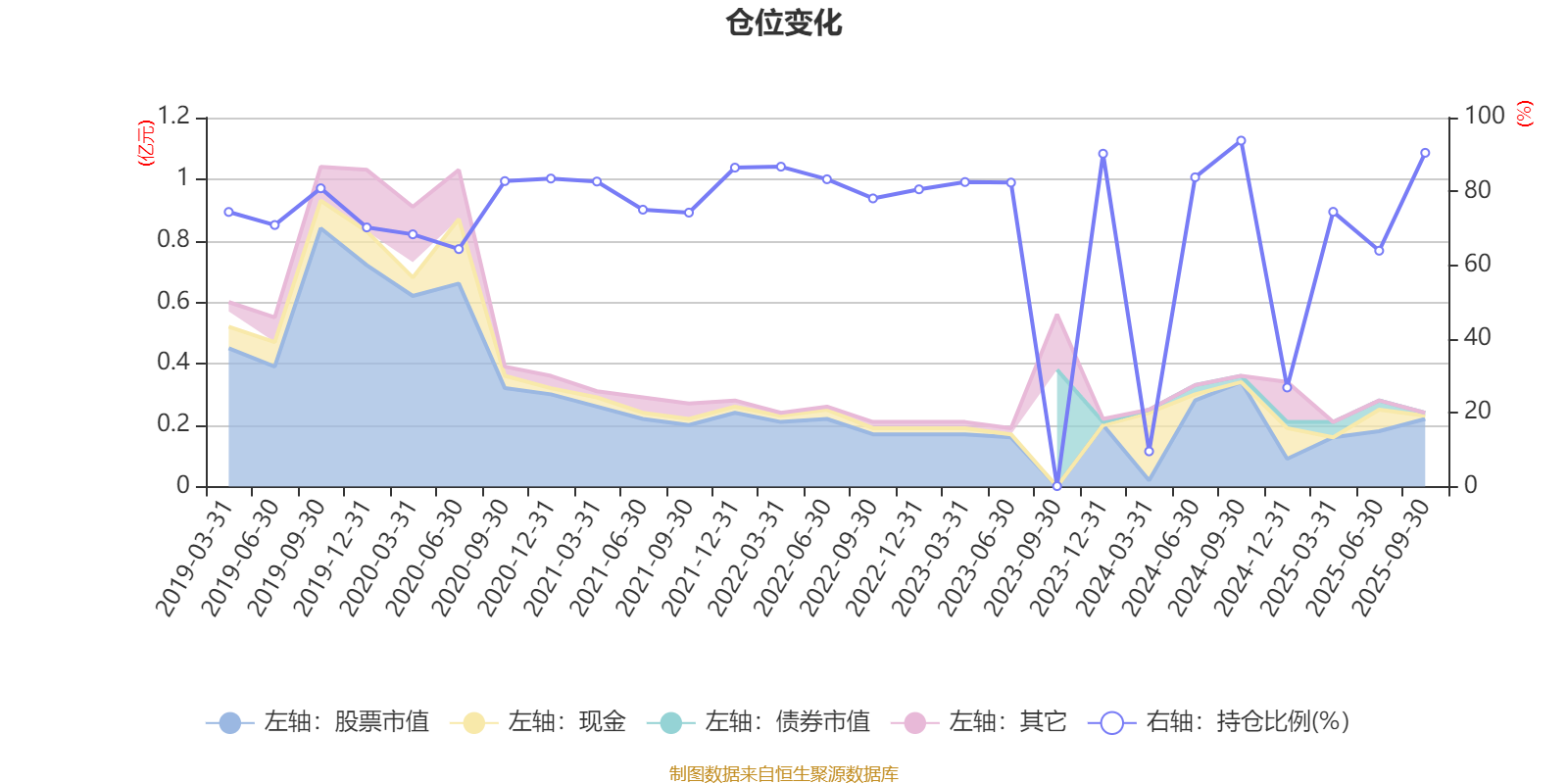 据定期报告数据统计,近三年平均股票仓位为64.89%,同类平均为72.35%。2024年三季度末基金达到93.76%的最高仓位,2023年三季度末最低,为0.12%。