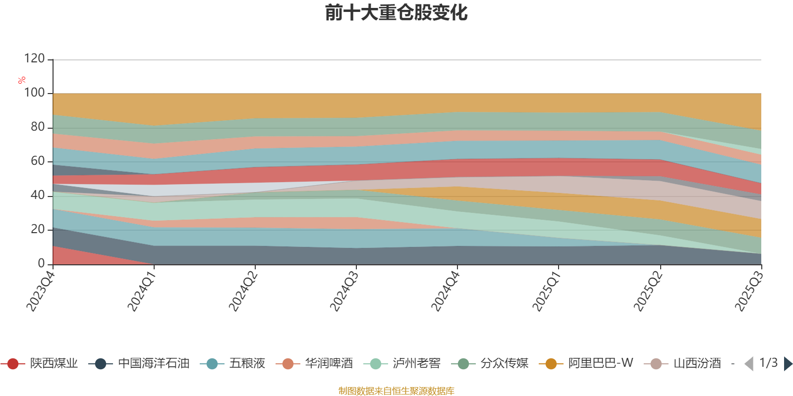 该基金持股集中度较高,近2年前十大重仓股集中度长期超过60%。截至2025年三季度末,基金十大重仓股分别是阿里巴巴-W、腾讯控股、贵州茅台、山西汾酒、分众传媒、巨子生物、中国海洋石油、古井贡酒、海大集团、宝丰能源。