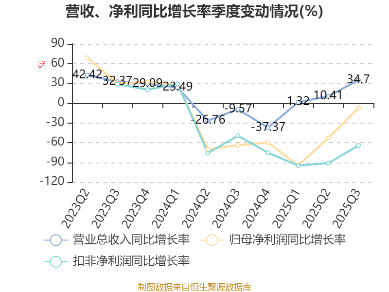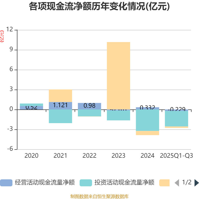2025年前三季度,公司经营活动现金流净额为-2291.46万元,同比增加3056.74万元;筹资活动现金流净额-2051.49万元,同比增加4158.9万元;投资活动现金流净额-2.34亿元,上年同期为-1.9亿元。