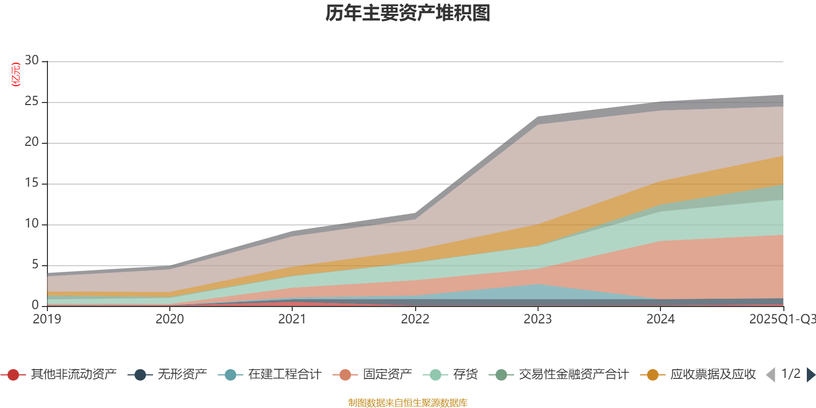 资产重大变化方面,截至2025年三季度末,公司货币资金较上年末减少30.28%,占公司总资产比重下降11.24个百分点;交易性金融资产合计较上年末增加117.65%,占公司总资产比重上升3.75个百分点;存货较上年末增加19.52%,占公司总资产比重上升2.25个百分点;应收票据及应收账款较上年末增加22.47%,占公司总资产比重上升2.13个百分点。