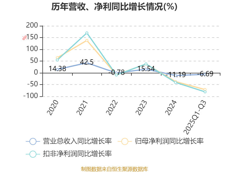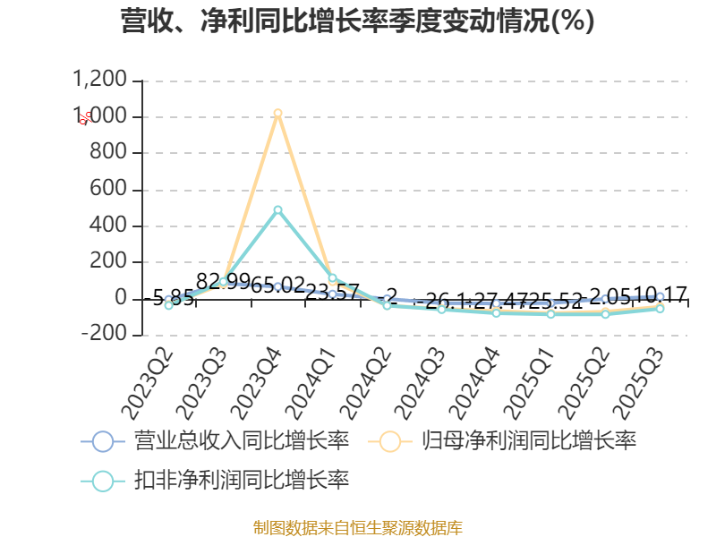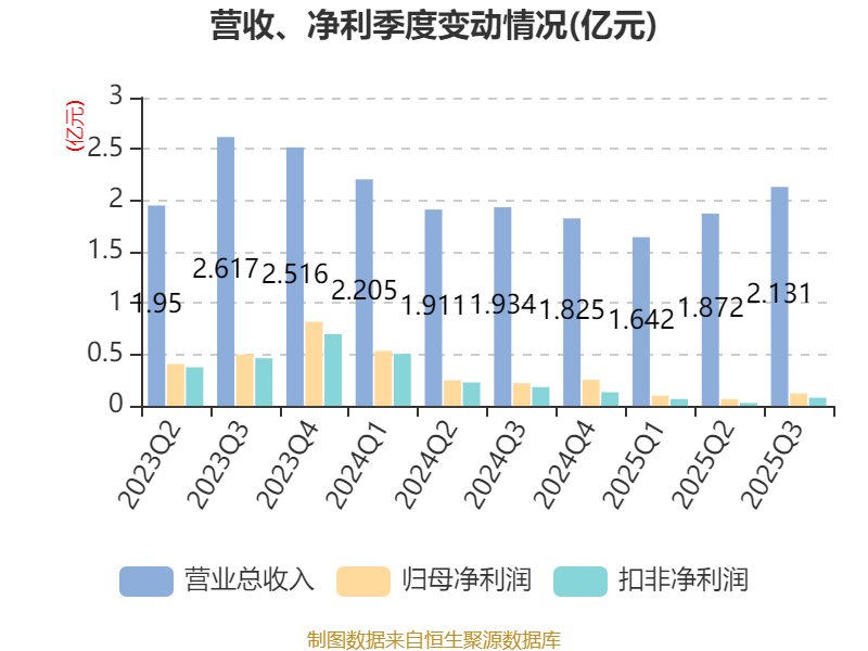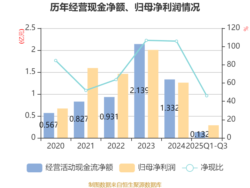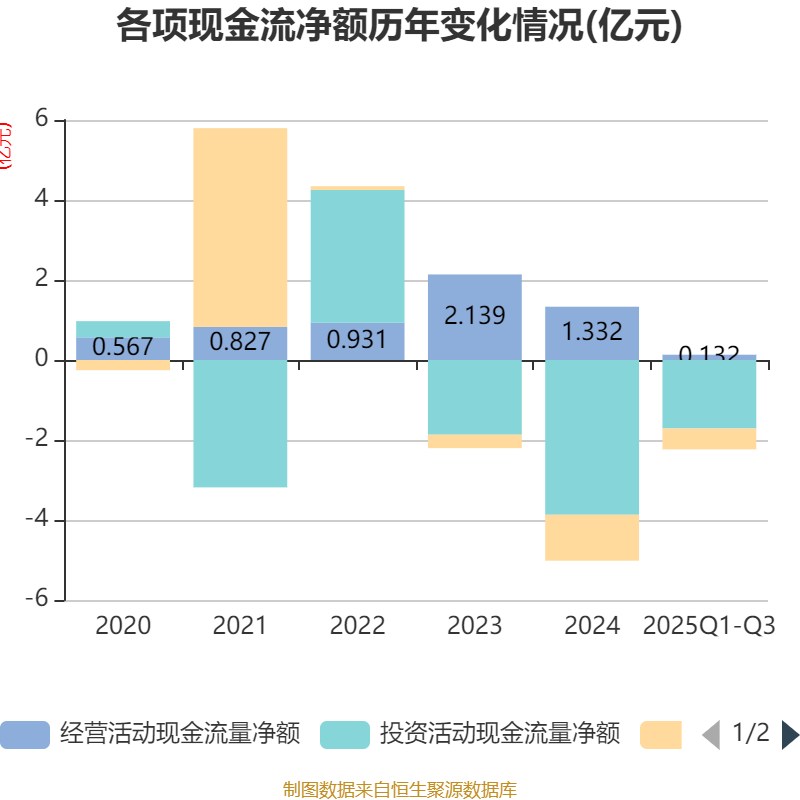 2025年前三季度,公司经营活动现金流净额为1323.78万元,同比下降85.66%;筹资活动现金流净额-5227.81万元,同比增加3908.6万元;投资活动现金流净额-1.71亿元,上年同期为-4.69亿元。