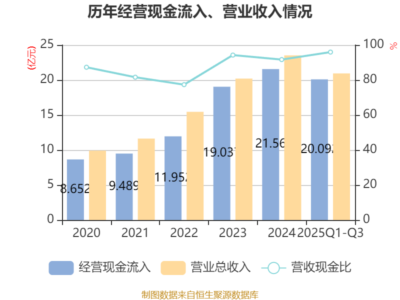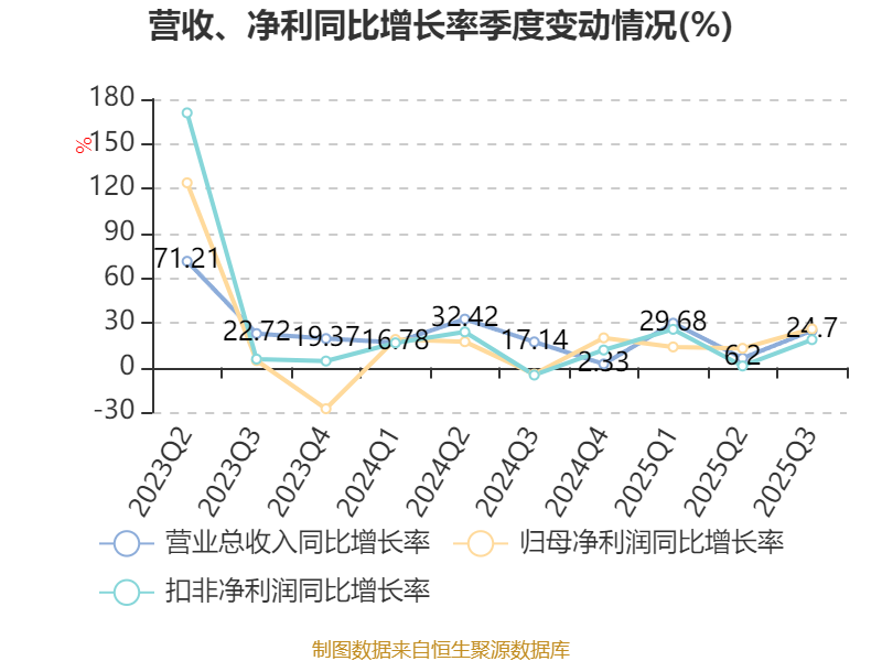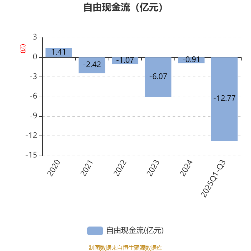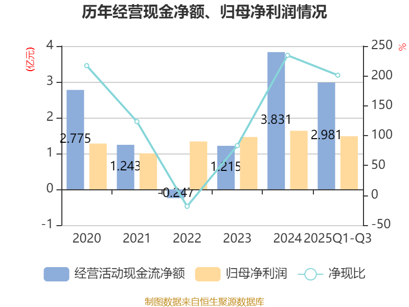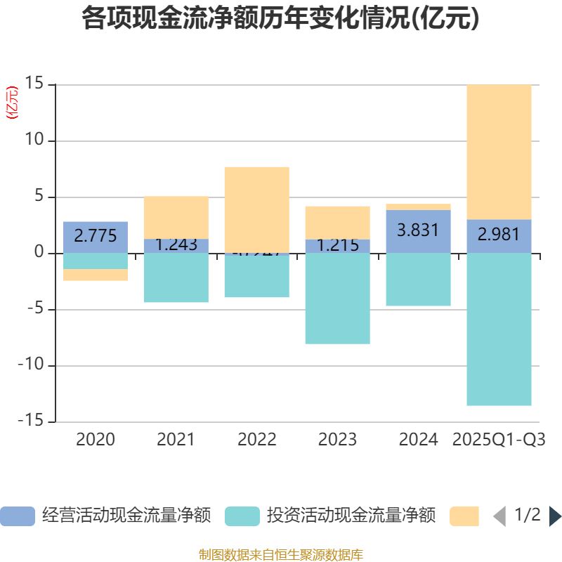 2025年前三季度,公司经营活动现金流净额为2.98亿元,同比增长68.97%;筹资活动现金流净额12亿元,同比增加10.27亿元;投资活动现金流净额-13.59亿元,上年同期为-3亿元。
