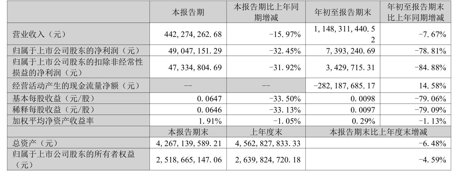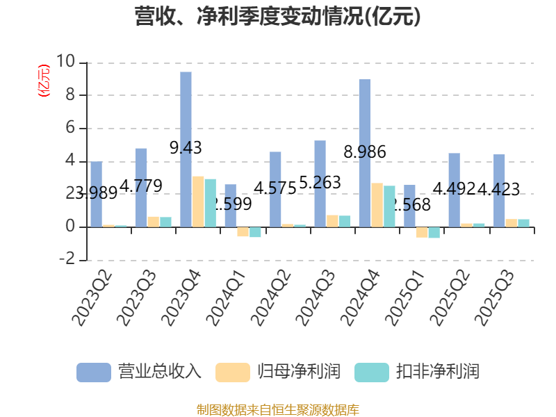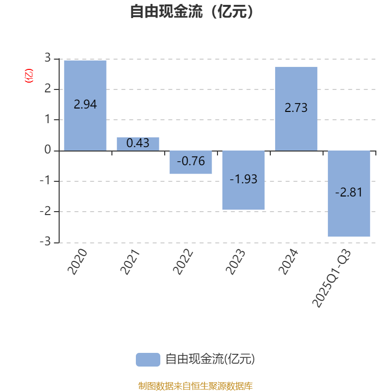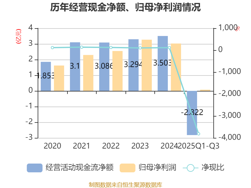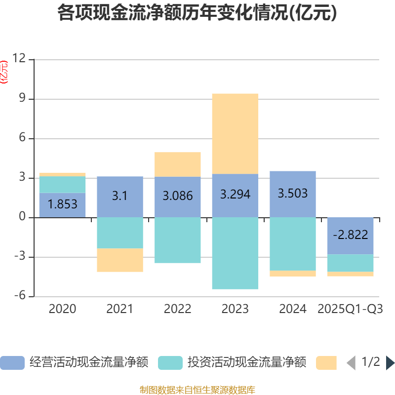 2025年前三季度,公司经营活动现金流净额为-2.82亿元,同比增加4816.83万元;筹资活动现金流净额-3376.89万元,同比增加1.04亿元;投资活动现金流净额-1.32亿元,上年同期为-2509.88万元。
