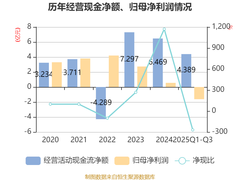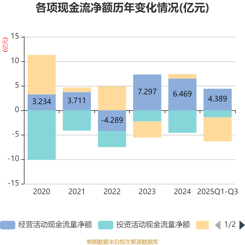 2025年前三季度,公司经营活动现金流净额为4.39亿元,同比增长110.54%;筹资活动现金流净额-4.93亿元,同比减少5.44亿元;投资活动现金流净额-1.43亿元,上年同期为-2.1亿元。