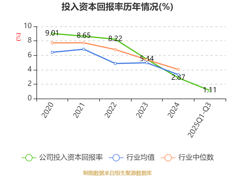 盈利能力方面, 2025年前三季度公司加权平均净资产收益率为-3.81%,同比下降4.98个百分点。公司2025年前三季度投入资本回报率为1.11%,较上年同期下降1.04个百分点。